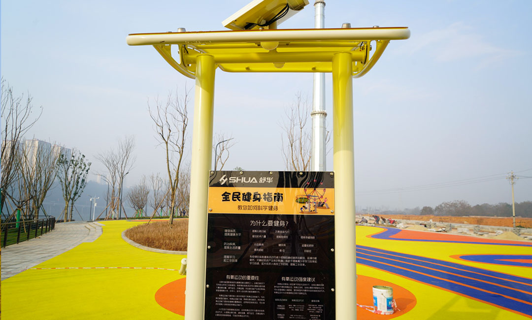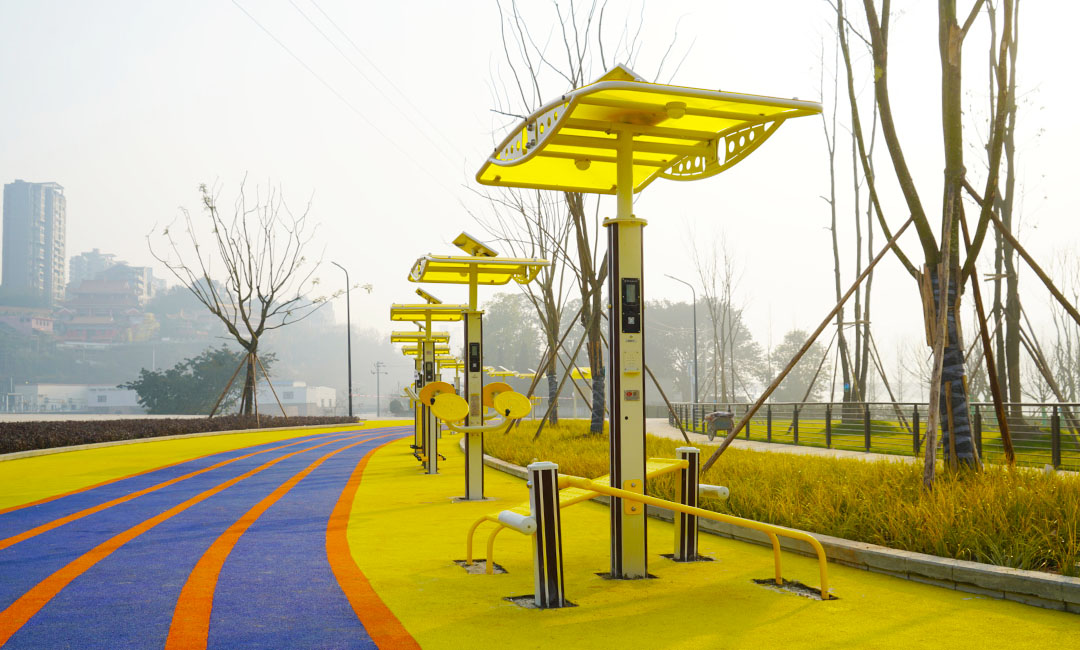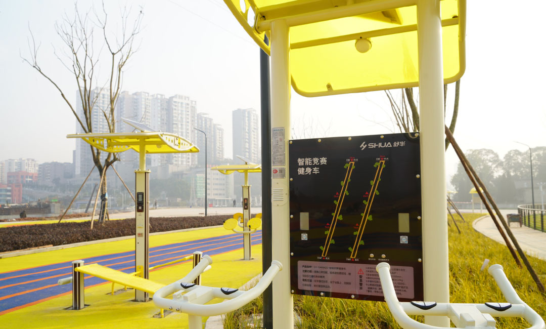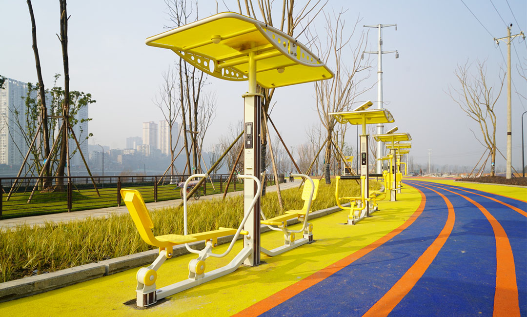 園區內的智能健身路徑是最為亮眼的一道風景線,脫離傳統健身路徑的單一性,此次,友杰體育為金福島體育公園所選用的是舒華二代智能健身路徑,其中的雙位智能健身車,是非常有趣味的一款器材,該器材專門為兩個人比賽用的互動競賽型健身車。當兩人開始比賽時,跑道上的燈帶會隨著運動距離的增加而疊加亮起,讓運動更具互動性,也更有趣味。這僅僅是其中一種,其余的二代智能健身路徑也各有千秋,可供雙人同時使用。更為有意思的是,這些器材還采用綠色太陽能進行供電,配套智能模塊。系統后端可收集器材的使用頻率、時長、卡路里、區域、人次、時間段等用戶運動數據,并生成各種維度的統計分析,為政府提供戶外場地設施利用率監測、全民健身情況及科學決策分析等大數據服務。
