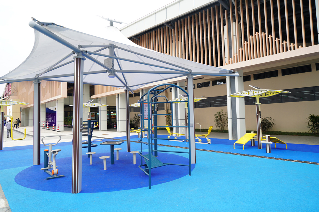 整個智能健身親子區分為幾個區域:健身訓練區,親子互動區,拉伸放松區,針對旅客不同的需求做了相對應的區分。
