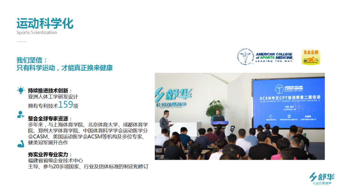依據運動科學化的原則,遵循人體工程學的準則,舒華新推出了一系列體能相關的器材,器材一經推出,就憑借其國際領先的技術水平和人工智能在行業內引起了廣泛關注。