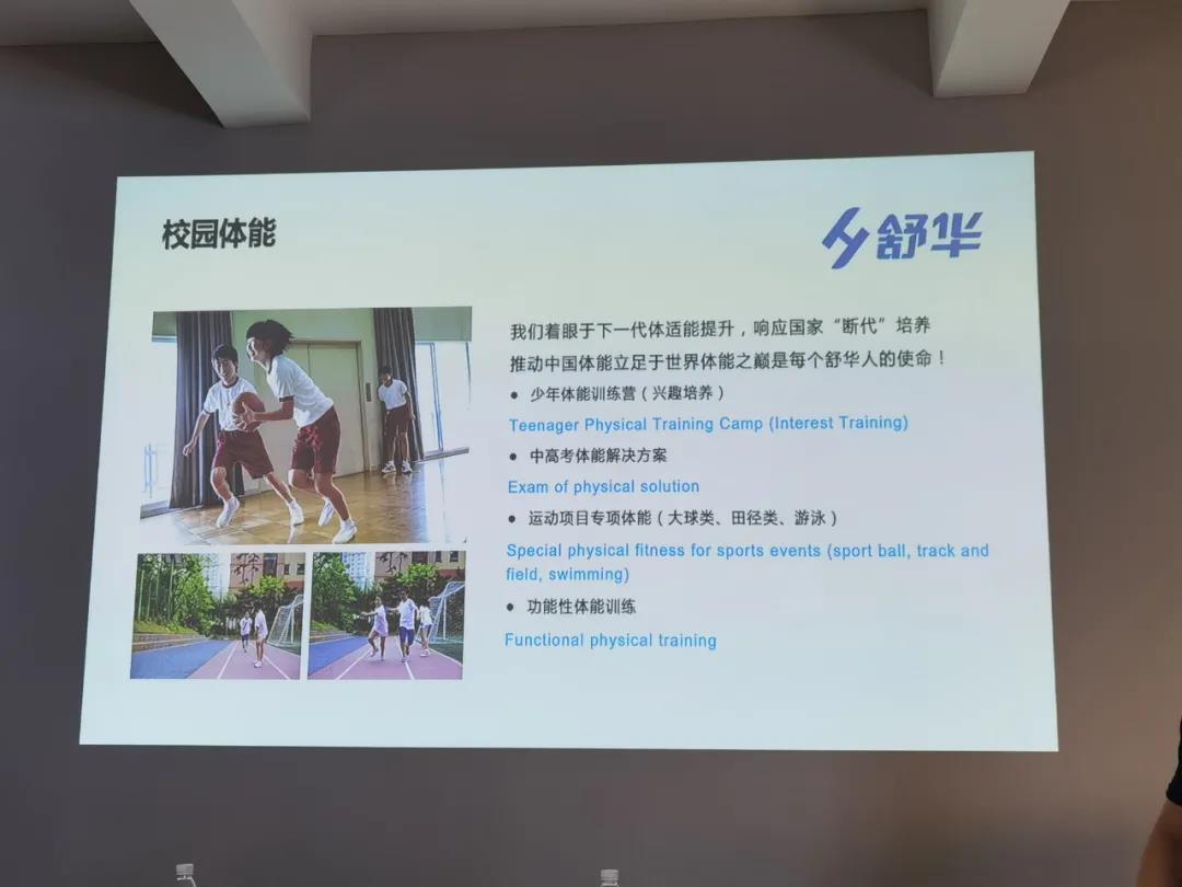 隨著社會對體能訓練需求的日益增加,舒華成立了體能專業團隊,團隊成員來自世界各地,他們由國際認證體能教練、運動表現專家、物理治療師、注冊營養師、體育心理學家組成,擁有深厚的專業知識及豐富經驗。可以針對個人,團隊或組織目標量身定制任何訓練需求產品。主要服務:運動場館規劃咨詢服務,運動設備研發與供應服務,運動表現能力評估服務, 健身與健康服務,運動表現訓練服務,戰術表現訓練服務等。