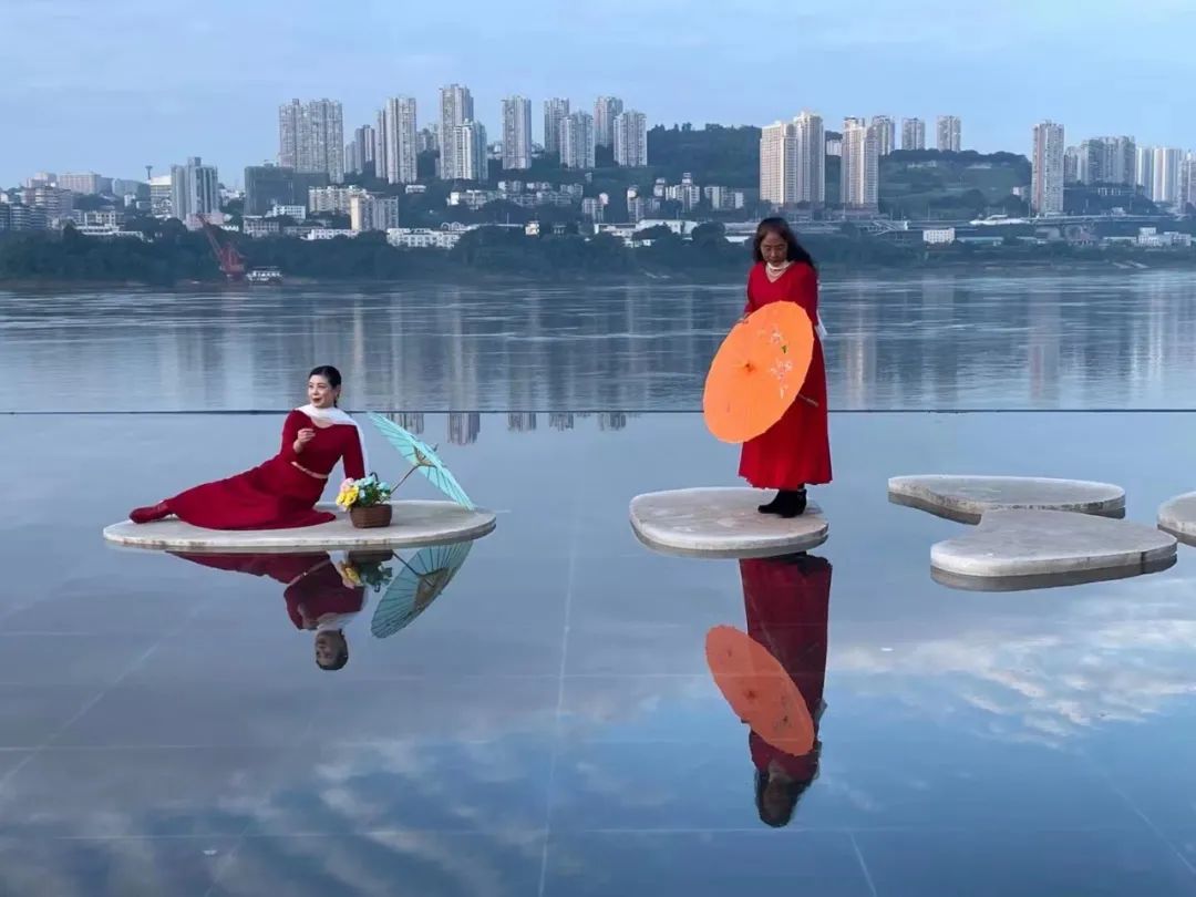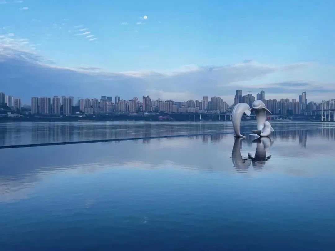 有人叫它重慶的小茶卡鹽湖,也有人說它是主城最美的天空之鏡。無邊水池里鯨魚出海的雕塑跟身后山城的美景呼應,讓沒有海卻對海有著瘋狂熱愛的重慶人民,著實享受了一次海邊的待遇。