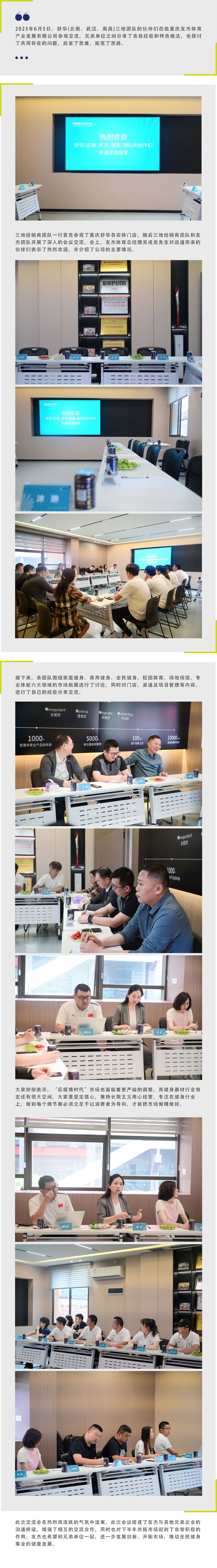 2023年6月5日,舒華(云南、武漢、南昌)三地團隊的伙伴們蒞臨重慶友杰體育產業發展有限公司參觀交流,兄弟單位之間分享了各自經驗和特色做法,也探討了共同存在的問題,啟發了思維,拓寬了思路。
