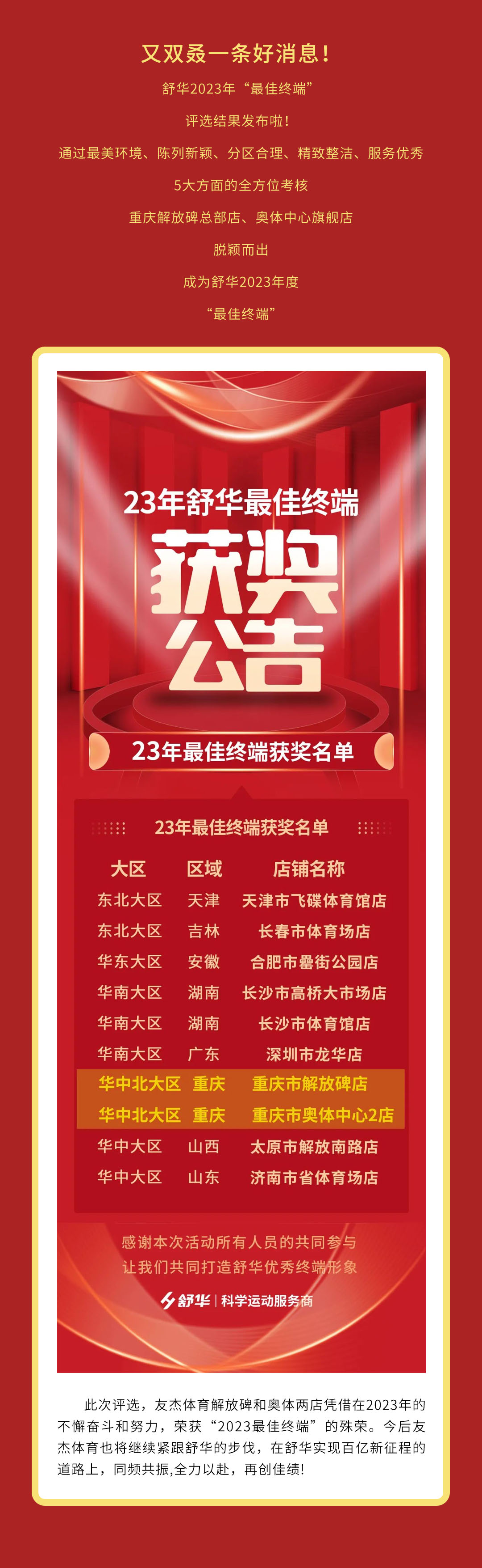 又雙叒一條好消息!舒華2023年“最佳終端”評選結(jié)果發(fā)布啦!通過最美環(huán)境、陳列新穎、分區(qū)合理、精致整潔、服務(wù)優(yōu)秀5大方面的全方位考核。重慶解放碑總部店、奧體中心旗艦店脫穎而出,成為舒華2023年度“最佳終端”。